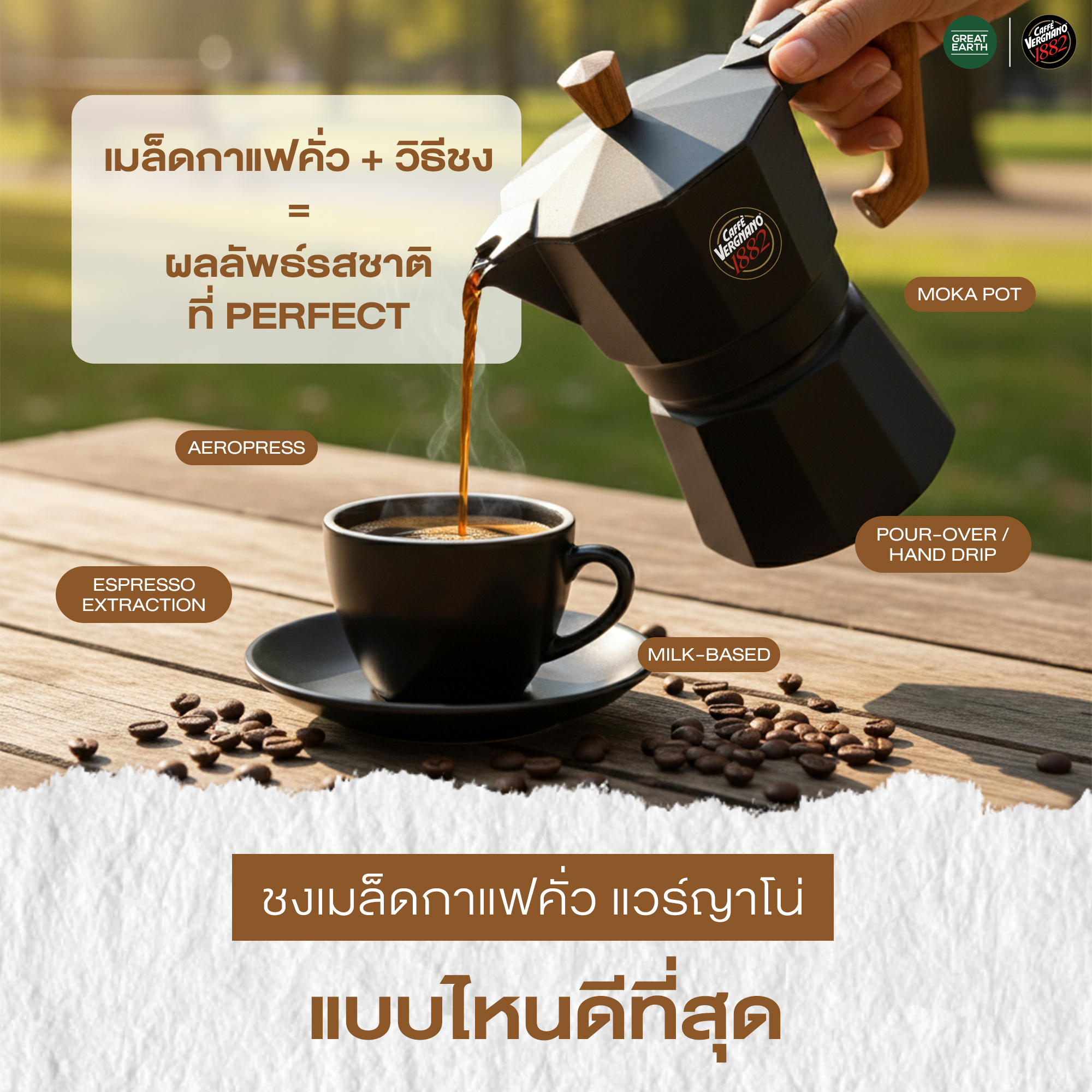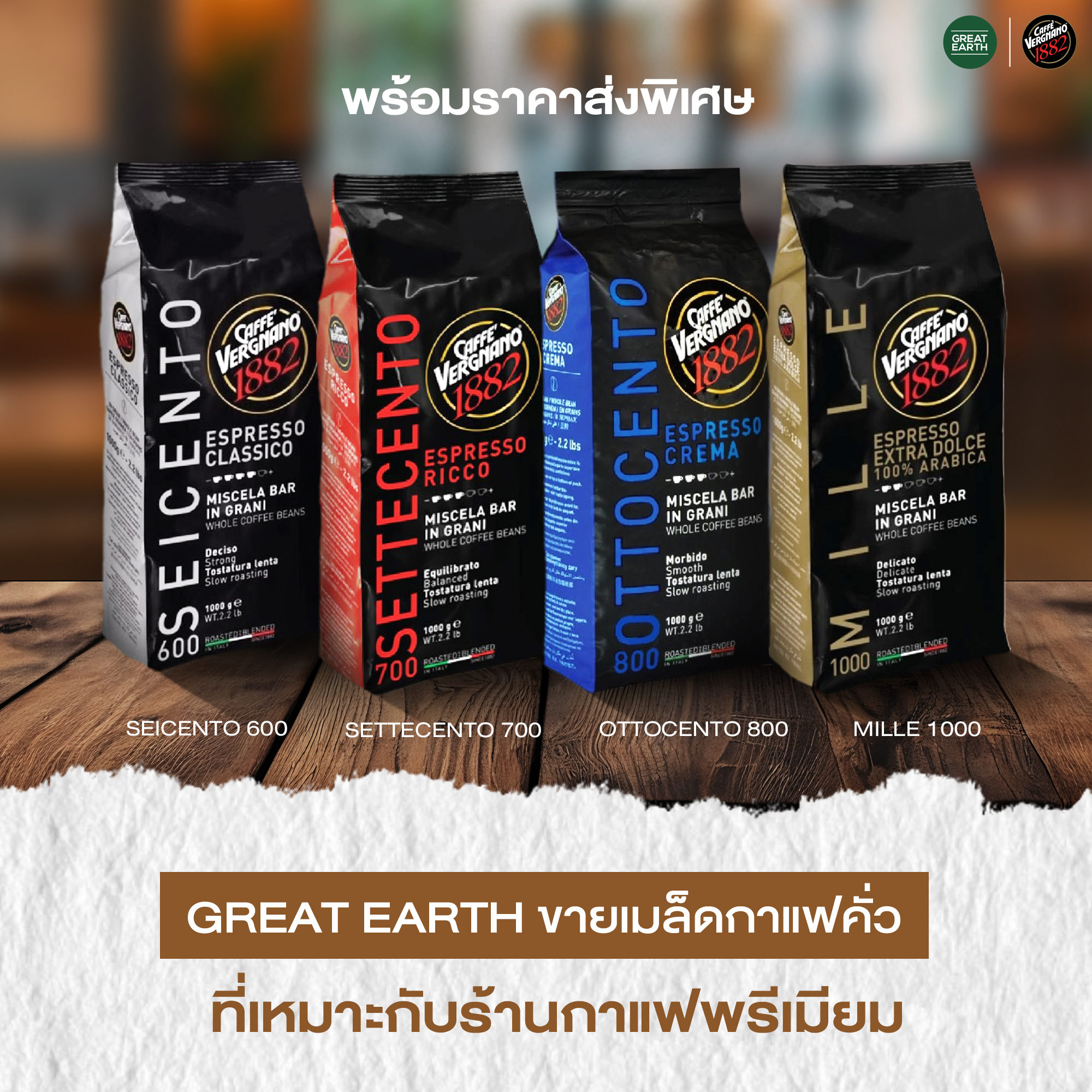 Great Earth ในฐานะผู้นำด้านกาแฟพรีเมียม ได้นำเข้าและคัดสรร เมล็ดกาแฟคั่ว Caffè Vergnano 1882 แบรนด์กาแฟอิตาเลียนระดับตำนาน ที่ได้รับความไว้วางใจจากร้านกาแฟและโรงแรมชั้นนำทั่วโลก เพื่อตอบโจทย์ทั้งร้านกาแฟพรีเมียมและธุรกิจที่มองหา เมล็ดกาแฟ ขายส่ง ที่มีคุณภาพสม่ำเสมอและรสชาติชัดเจนในทุกล็อต