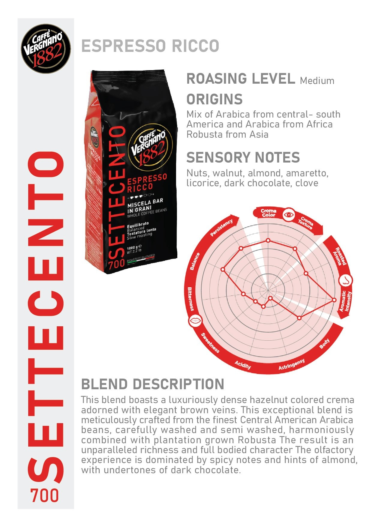 Espresso Ricco 700 boasts a luxuriously dense hazelnut-colored crema adorned with elegant brown veins. This exceptional blend is meticulously crafted from the finest Central American Arabica beans, carefully washed and semi-washed, harmoniously combined with plantation-grown Robusta. The result is an unparalleled richness and full-bodied character. The olfactory experience is dominated by spicy notes and hints of almond, with undertones of dark chocolate.