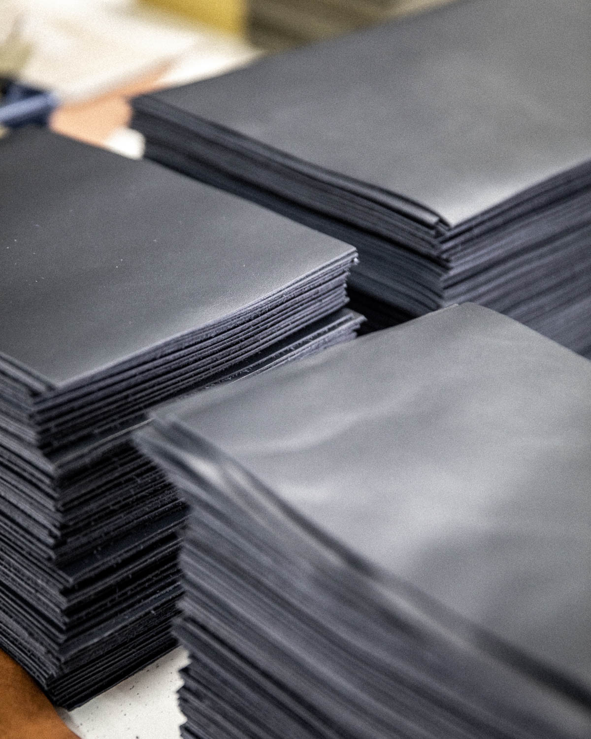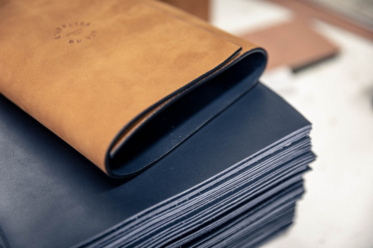 The exterior of each pouch is in unworked fawn leather, raw color. The leather takes on a patina over time and through peregrinations. The interior of each case is in resistant and colored technical leather.