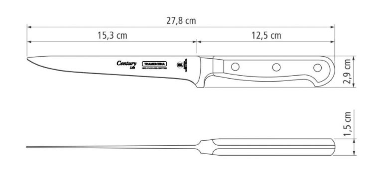 The Century Line knives have been especially designed for intense use. They receive a thermal treatment which consists of hardening (heating the blade), subzero (cooling from 50 to -196 degrees), and tempering (increasing the steel elasticity) for a longer and more efficient life. The anatomical and ergonomic handle offers safety during use. Made of polycarbonate and fiberglass, the handle is directly injected on the steel bolster and finalized with aluminum rivets. The Century Line has a 25-year warranty covering manufacturing faults and is certified by the NSF, National Sanitation Foundation, an organization internationally recognized by its consultancy, inspection, and training practices aimed at guaranteeing the sanitation of food, water, air, and the environment. The pieces are dishwasher safe.