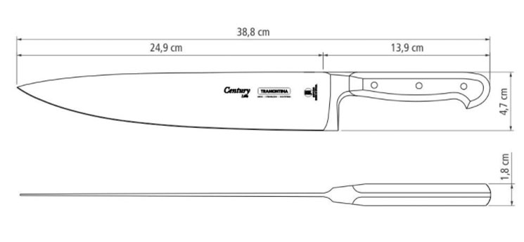 The Century Line knives have been especially designed for intense use. They receive a thermal treatment which consists of hardening (heating the blade), subzero (cooling from 50 to -196 degrees), and tempering (increasing the steel elasticity) for a longer and more efficient life. The anatomical and ergonomic handle offers safety during use. Made of polycarbonate and fiberglass, the handle is directly injected on the steel bolster and finalized with aluminum rivets. The Century Line has a 25-year warranty covering manufacturing faults and is certified by the NSF, National Sanitation Foundation, an organization internationally recognized by its consultancy, inspection, and training practices aimed at guaranteeing the sanitation of food, water, air, and the environment. The pieces are dishwasher safe.